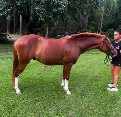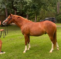 Arondight - 2023 registered 1/2 Welsh gelding. Currently cold-measures slightly over 13.0H. Expected to mature 13.1 1/2H - 13.2H. Beautiful moving pony with a huge, ground-covering, balanced canter. Scope for days free-jumping, which guarantees he will walk the pony hunter step. Showed in-hand as a yearling. He is bridle and saddle broke and has been lightly backed. He is a grandson of the famous hunter pony sire, Halcyon Sir Lancelot. His Sire: Friarly Master of Fashion (11.2H), dam, Cherrybrook Shelby (Welsh/Tb, 14.1H). He is an elite investment hunter pony with a pedigree that guarantees a winning career.