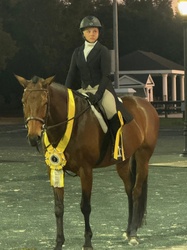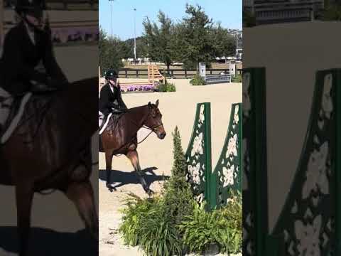 Available at HITS OCALA for trials. Beautiful hunter mare that has taken a beginner kid from 2’3” and is now stepping up to the 3’, and has been winning every step of the way. Sadly outgrown and looking for her next child or adult to show the ropes to. She is super brave, great mover that has an easy change, takes a joke, has a soft mouth and a soft jump, is incredibly rhythmical and comfortable, and even trail rides with ease. Cara is the teddy bear type that wants to wash away your bad day with her snuggles. She takes minimal to no prep ( lunge the first day) at the shows and does not need to see the jumps beforehand. She does not require hormones , but thrives with daily turnout and a regular program. I have no doubt that she will continue to be the barn/trainer favorite as she is so simple and easy to ride and deal with. Let her take you to the winner’s circle too!