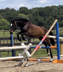 She has a great personality and is good on the ground. Loves to be groomed and loves your attention. She has been lightly backed but I have not had the time to work her consistently enough to do anything more than walk, trot, canter and go over some cavalettis. She has 3 lovely gates which include a ground covering canter which is extremely comfortable to ride. While she does stick at 16.0h right now, this girl is a slow grower and will get a little bit more height before she is finished! I have also included a picture of her mother jumping as well for a reference as to how she could be finished!