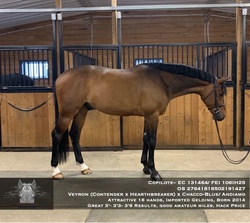 Imported in 2020 from Europe, he has a record to 1,20m over seas and also a successful record up to the 3'6 green. Brave, with auto changes, he is very good a managing his stride length. Soft mouth and smooth gaits make him a great amateur/junior ride.