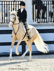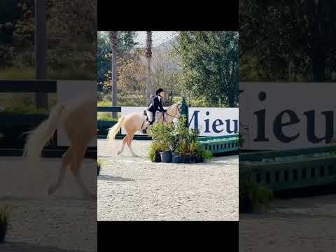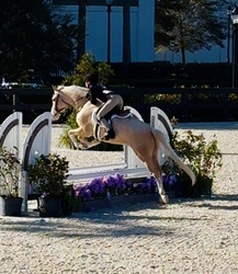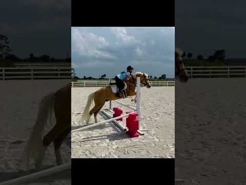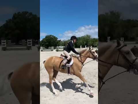 “Nimbus” is a coming 6 year old palomino med NA Sport pony gelding. Has the step and scope for the division and always gets a piece of the hack. Sails over 2’6” easily and is always brave to the jumps. Still eligible green with many miles at in shows all over FL. He is a born hunter with the softest canter, excellent extension, and a natural (if slightly green) lead change. He’s good for clipping, farrier, bathing, trailering, mounting, etc. Loves all other animals and people and will always meet you at the gate. So flashy that he’s impossible to miss!