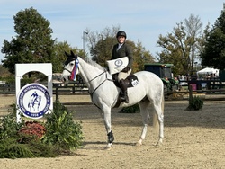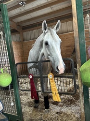 Jackpot is a loveable, easy-going imported gelding with consistent show experience for the last 3 years with an amateur and a pro. Has done up to 1.3m with a pro and 1.15m with an amateur. Comes out the same horse every day, no prep, quiet in the barn (the one your non-horse husband will hold ringside without an issue!). Clips, trailers, easy in turnout, no bad manners or vices. Very personable. Jackpot has his own motor but does not drag you to the fences. Jackpot is appropriate for an amateur or a junior. Has lead changes, they need some polishing but when you are on course he offers them. Very nice flatwork - leg yields, collection, extension.