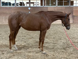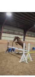 On Y Va (aka Eva) is by the Selle Francais stallion On Ira (Voltaire/Joyau D 'Or A/Turner) that stands at Pikturesque Farm in Ontario, Canada, out of a TB dam by the famous TB Crown Attorney. She has 3 very good correct basic gaits and is expected to finish growing at 16.3. She is drawn to the jumps when loose in the arena proving her genetics and future ability as a show hunter. Eva is growing into a lovely prospect and is ready to be started under saddle. Updated videos as she develops.