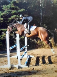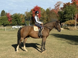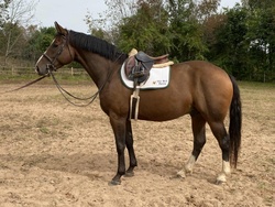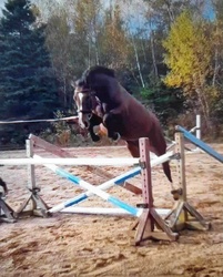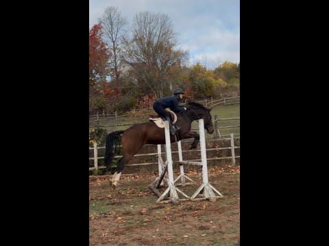 Due to time constraints, Tony was started late in 2023. He has had intermittent professional training with Jill Swain and is currently flatted 2-3 x weekly by an adult amateur. He is a snaffle ride with three comfortable gates, solid changes and has started jumping small courses. He has great work ethic with no dirt. Full transparency, he can occasionally look at things at the start of a ride, but this only lasts a few minutes or disappears completely with more consistent riding. He is otherwise brave, and more of a push ride on the flat, but has a motor, a big step, and is always eager to take his rider to the fences. His jump is powerful, scopey and careful. He can be quick and jumps in great form. A little more work over winter and he should be ready for the show ring next season. Why not buy this horse at a great price? Just a few more miles and it will surely double.